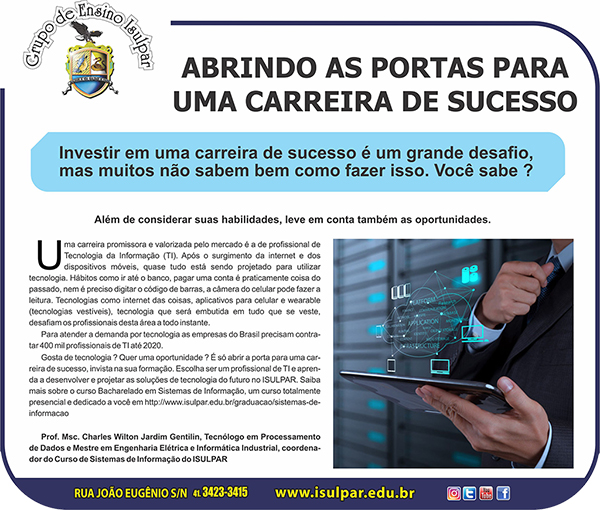 O alto índice de aprovação no exame da OAB e a grande inserção de nossos egressos no mercado de trabalho é motivo de satisfação e orgulho para todos que estiveram ou estão envolvidos nos processos de gestão e ensino no Curso de Direito do Isulpar, ao longo de seus 13 anos de existência, corroborando a qualidade da educação jurídica ofertada em nossa instituição. O Curso de Direito do Isulpar se desenvolve atento à pluralidade, à complexidade e à inovação que caracterizam o mundo contemporâneo.